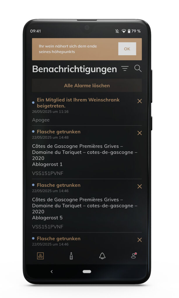 Vinotag benachrichtigt Sie, sobald Ihr Wein seine optimale Reife erreicht hat. Falls Sie ihn noch nicht verkostet haben, erinnert Sie Vinotag rechtzeitig, bevor er sein Aroma verliert – dank einer Benachrichtigung zum Ende der Reifezeit.