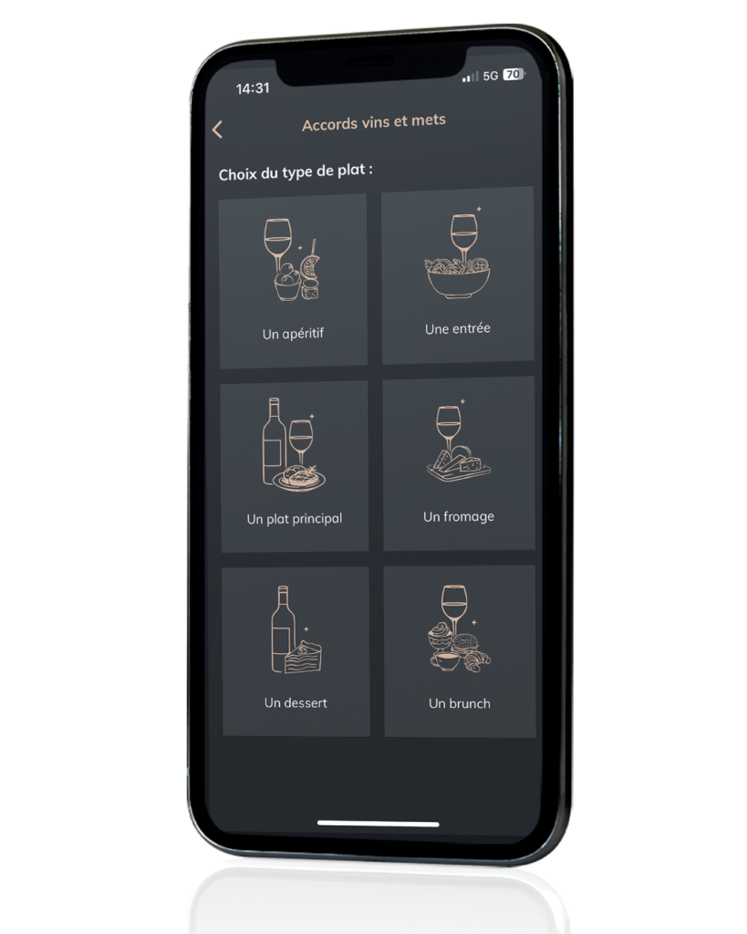 - Accords mets et vins : Choisissez un plat et obtenez instantanément une sélection de bouteilles de votre cave qui l’accompagneront parfaitement.