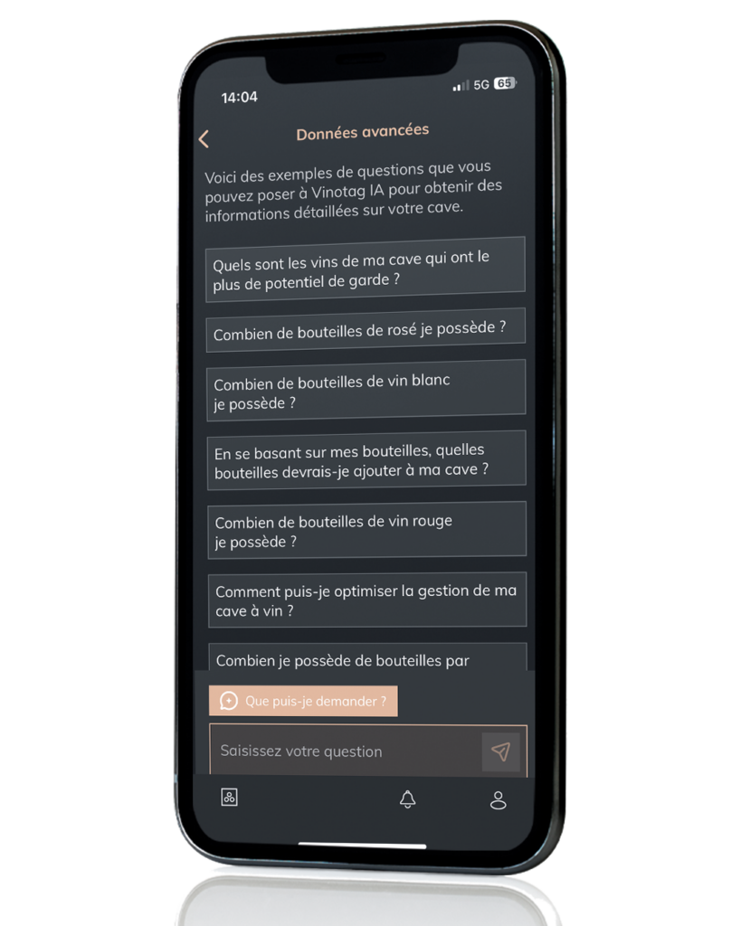 - Données avancées : Profitez d’analyses personnalisées de votre cave : vos habitudes, la valeur de vos vins et ceux à ouvrir en priorité.